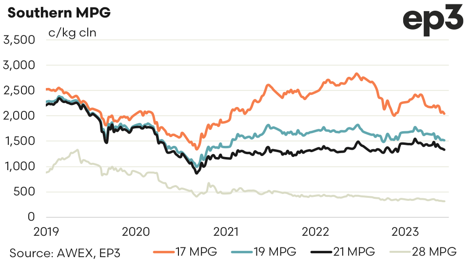 The auction certainly delivered disappointing result this week. With a solid close and lighter volumes in the absence of a Western Australia sale expectations were for a base being formed in the spot market. The lack of follow up offshore business was not helped by a stronger Australian Dollar. A weak AUD will, at best, dampen the impact of falling markets or accelerate the rises. This is confirmed in the shorter term by the seasonal highs in February occurred with the AUD ranging from 69.5 to 70 cents. A closer look at the last decade would again show the cyclic nature of the wool market responding to the direction of macroeconomic demand & supply factors more readily than the AUD/USD trends.