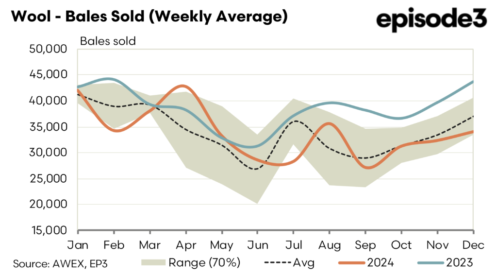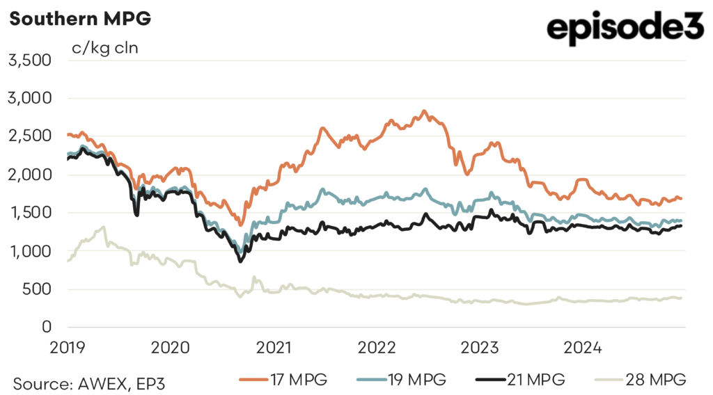 The forward market reflects this with sporadic trading when demand lifts and traders look for cover. This week’s trades were confined 19.5 microns. January traded at 1415 and May at 1425. This represented a 35 and 45 cent premium to the close of auction. Bidding for the New Year remains steady with premiums rising as we move through the year. Premiums start around 1 to 2% for the first quarter raising to 4% at years end. 2026 currently bid in small quantities at a 6% premium.