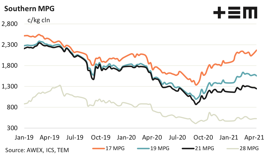 Supply continues to weigh on 21 micron prices relative to the finer merino categories. While the 21 micron supply will not determine the overall trend and cycles of the broader merino market, it heavily influences the broad merino prices relative to other micron categories and apparel fibres.