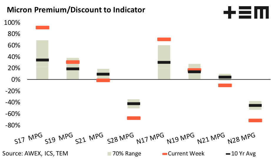 Exporter feedback indicates there is interest for RWS accredited wool in these categories, an area of wool production not usually linked to premiums. It is a changing world. Micron premiums and discounts for merino wool remains large in cents per kg terms. However the merino clip looks to have finished its post drought broadening cycle, and this will reduce some of the stimulus for wide micron premiums and discounts.