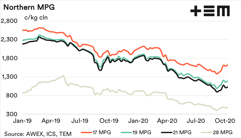 The 19 MPG lifted this week, not falling as speculated upon last week. The 19 MPG remains in the upper part of its price range traded across since late August, and probably remains a good level at which to sell physical wool. No real pull through demand has been reported from retailers. It is too early yet to expect this.