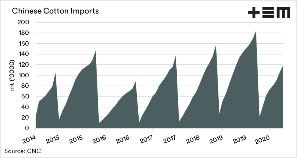 Up until August, China had imported 17% less cotton than the same time last year. This is in contrast to other agricultural commodities (ex Barley) which are all firmly up. The export number is a sign of reduced demand for imports, in part due to CV-19 reducing apparel requirements.