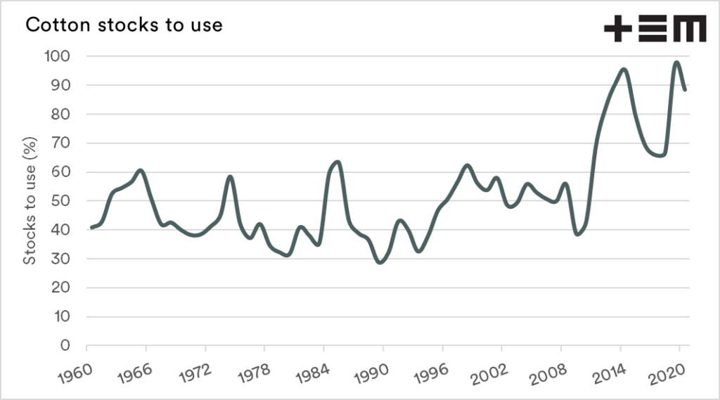 Whilst we weren’t producing the rest of the world didn’t stop. The world cotton market is now well supplied, and whilst the stocks to use ration has fallen this year, it remains very high.