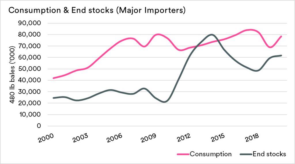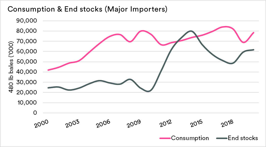 The leading importers of Australian cotton have experienced increases in their stocks, with a very narrow spread between consumption and stocks.