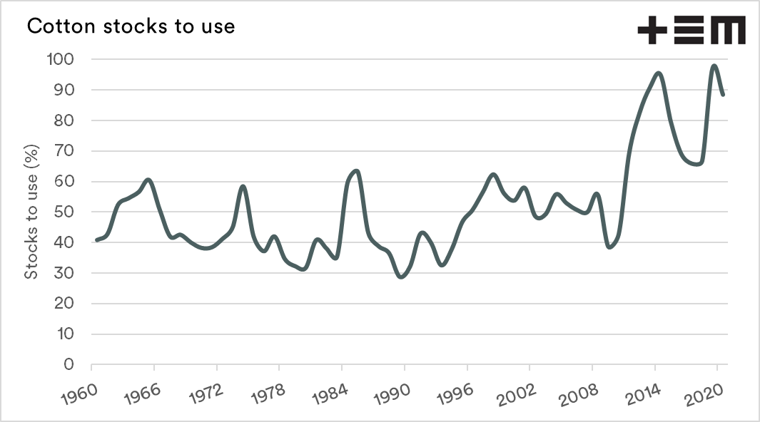 At present, the stocks to use ratio is at 89%, which means that if the world were to produce no cotton next year, then there would be enough in stores to meet nearly a years demand.