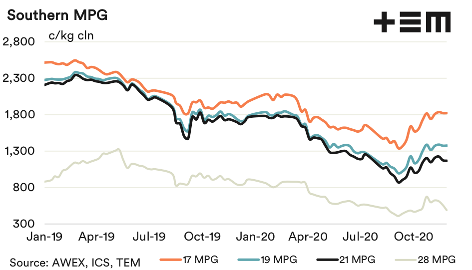 The 17 MPG continues to trade at levels well above where it has traded at for large slabs of the past two decades. The greasy wool market is in the middle of a major downturn (prices are down by nearly 60% since mid-2018) so the performance of fine merino wool is well beyond expectations from early in this season, and should continue to out perform.