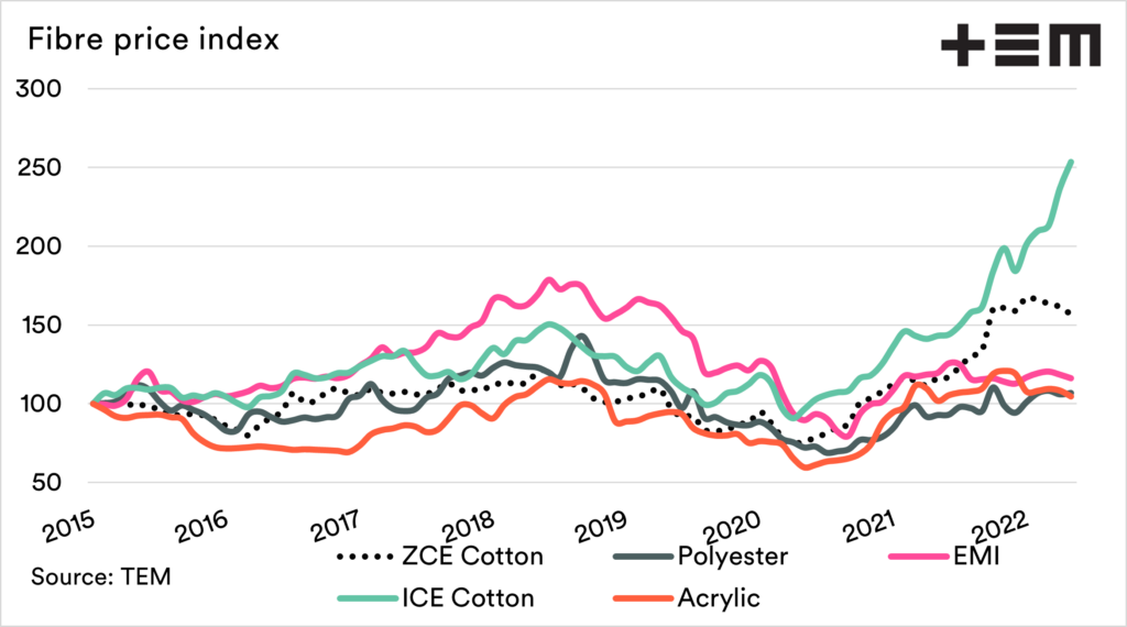 We can see that the EMI isn’t keeping up with the price of cotton. Prices recovered in 2021 after the COVID fall but have overall not really seen an uplift since then.
