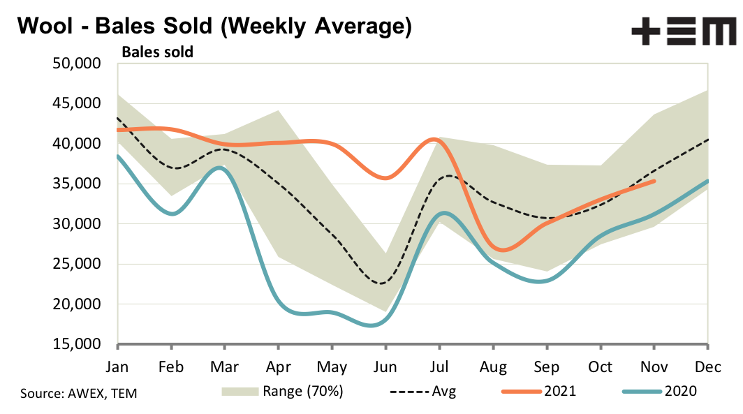 The 19 micron category is the middle/average of the Australian merino clip. As such it did not change much this week as the finer micron categories weakened and the broader micron categories strengthened. Discounts for vegetable matter around 2% continue to shrink.