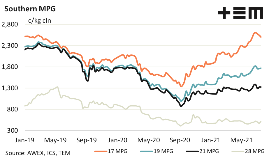 Forward interest for these categories (through 19 and 21 micron) remains solid with a 21 micron contract trading for spring 2022 a little over this weeks auction level. Forward bids for finer merino categories reflect a view that fine micron premiums are somewhere near their upper limit and have a good chance of shrinking as the 2021-22 season progresses.