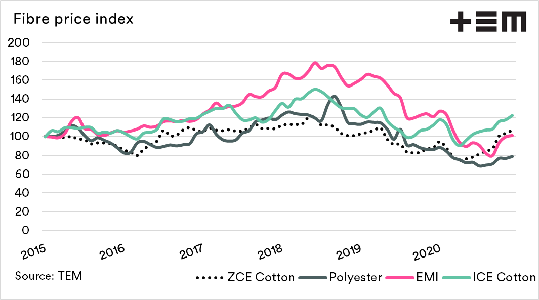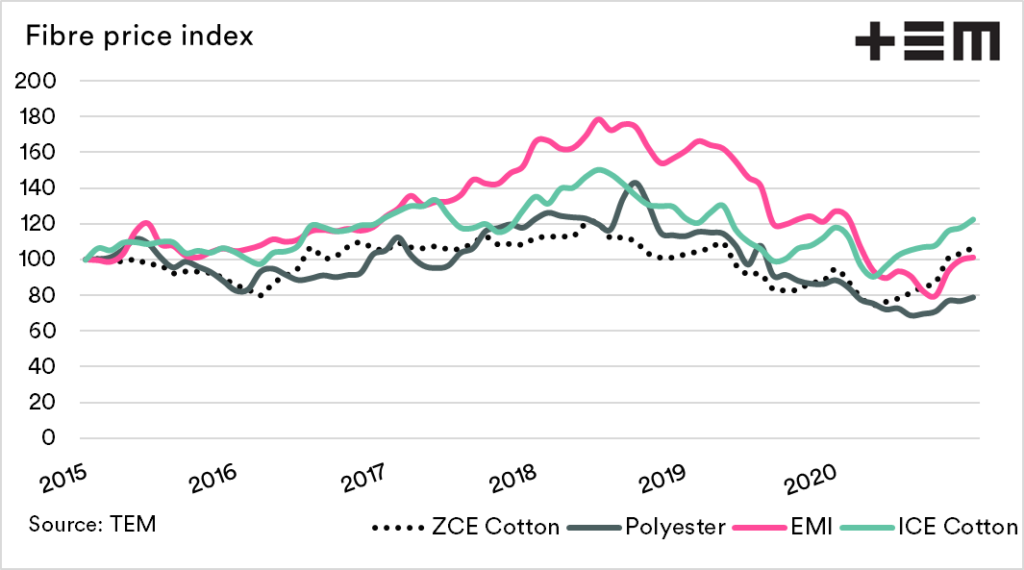 The apparel market peaked during 2018 but has been on a downward trajectory since. Since mid-year, the fibre market has recovered.
