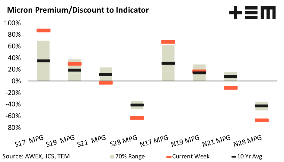 The strength of demand for merino wool continued this week, pulling premiums for finer wool higher and absorbing big increases in broader merino volumes. In historic terms the difference in price between fine, medium and broad merino categories is high, with comments starting to come out of the supply chain reflecting this.