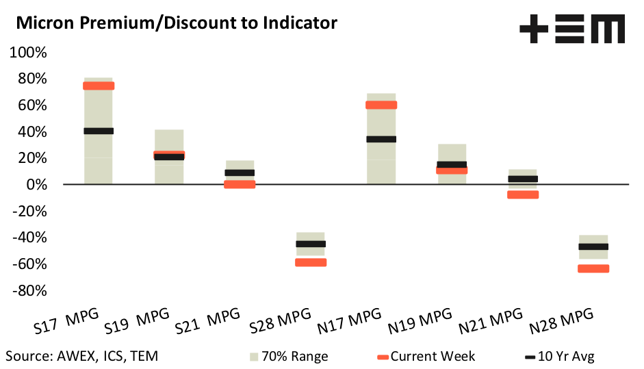 The merino micron price curve continues to rise, with the difference in price between 2 microns finer and 2 microns broader than the average merino micron currently on par with levels reached in 2011, 2002, 2003 and 1988.This is a big turnaround from the depressed levels of mid-2019.