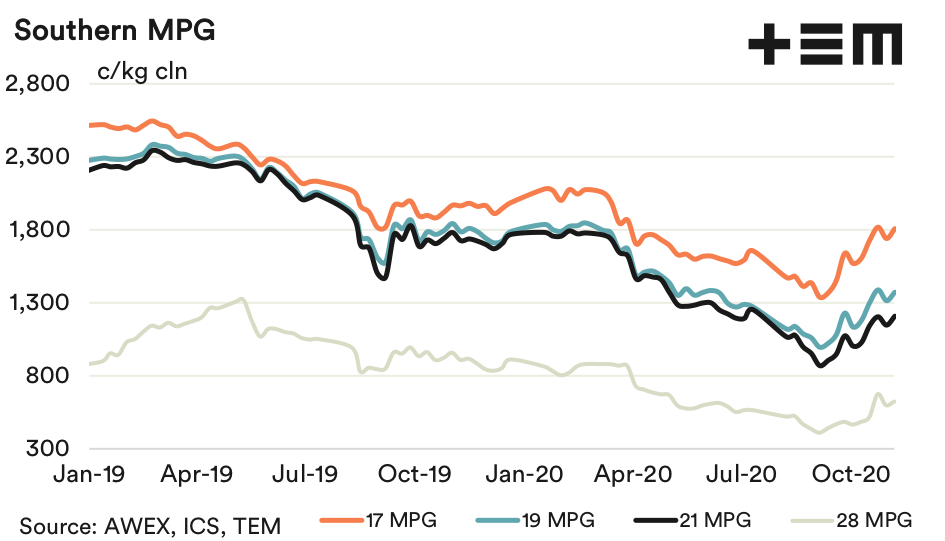 So far the 19 MPG has traded within the proposed 1300 to 1450 cents trading range, albeit on a quicker and more volatile schedule than anticipated. Most apparel fibre/feedstock price series looked to have bottomed out early this season and have lifted since then as have a range of other commodities. This provides more confidence that the worst of the COVID-19 downturn in prices has been seen.