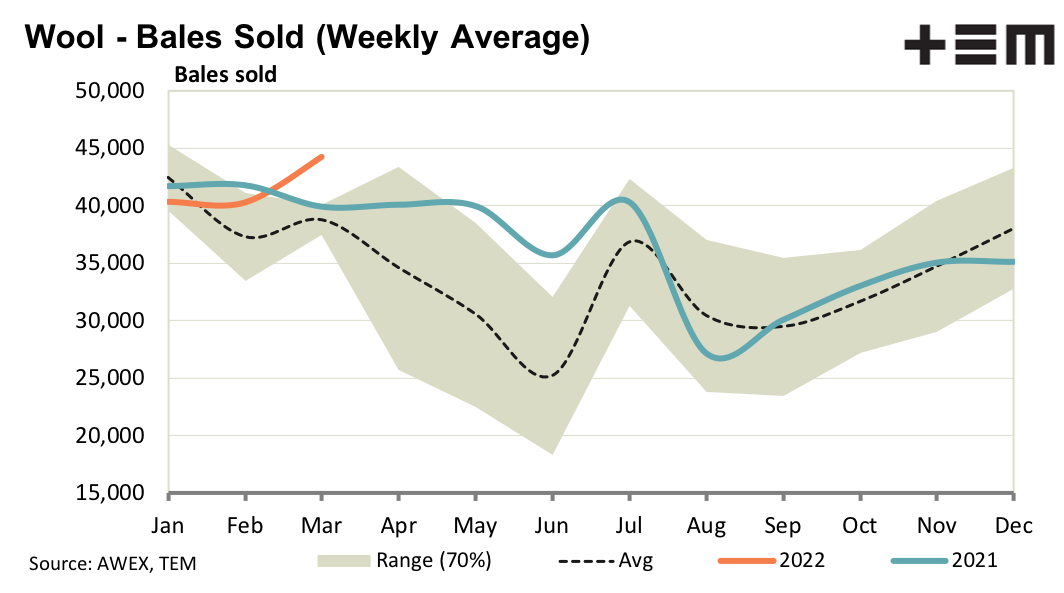 In March (to date) eastern merino clip is running 0.2 micron finer while in the west it is running 0.39 micron broader. Changes in the eastern clip will dominate changes in the finer micron categories so the market will have to accommodate more fine merino wool which should put some downward pressure on fine wool premiums.