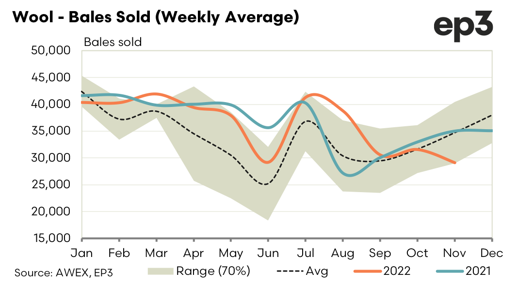 Wool producers have responded to the easing market by reducing sales volumes over the month. The average weekly wool sales volumes over November was 29,123 bales, which is the lowest weekly sales have been this year including the mid-winter dip seen in June when average weekly sales fell to 29,203 bales.