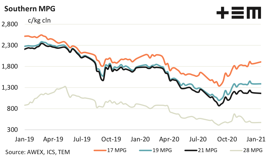 The 28 MPG lifted slightly this week, with its price ratio to the 21 MPG trading around a lowly 0.4. There does not appear to be much downside for the 28 MPG while broad merino prices stay solid, but weak demand also points to limited upside as well.