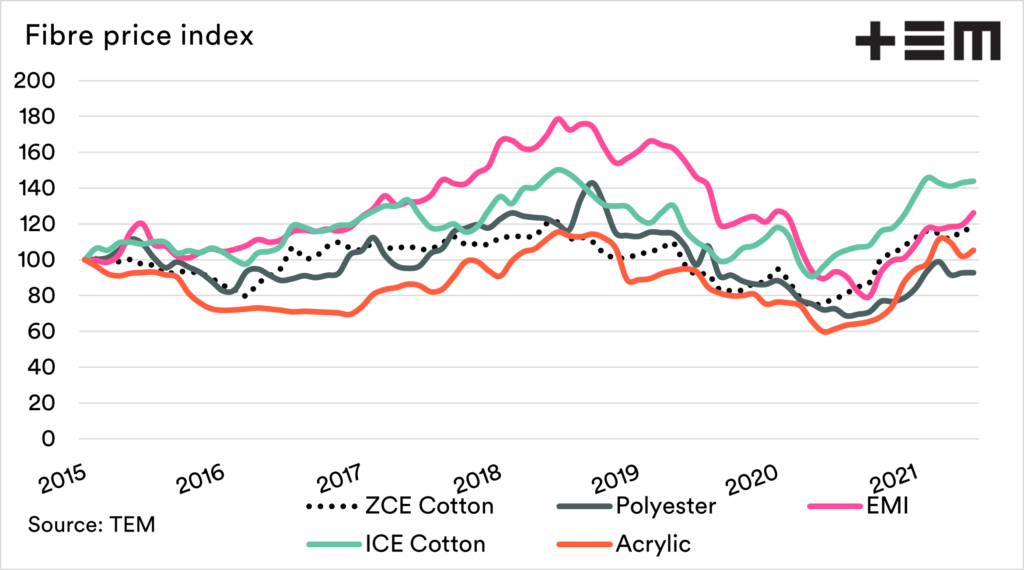 The synthetic fibres indexes rose this month, with acrylic up 3.41%, whilst polyester was essentially unchanged.