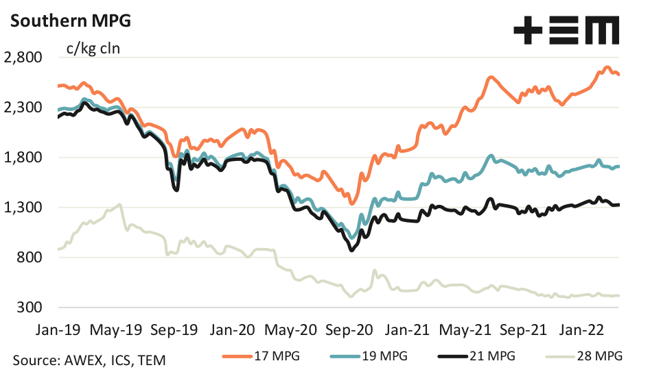 2650-2700 cents looks to be the upper limit for the 17 MPG. The run up by the 17 MPG during the past month has resulted in the best prices since the spring of 2018 when the wool market started to roll off the peak levels of 2017 and 2018. Early stage processors go into a quieter time in the coming months, which tends to correlate with weaker prices.