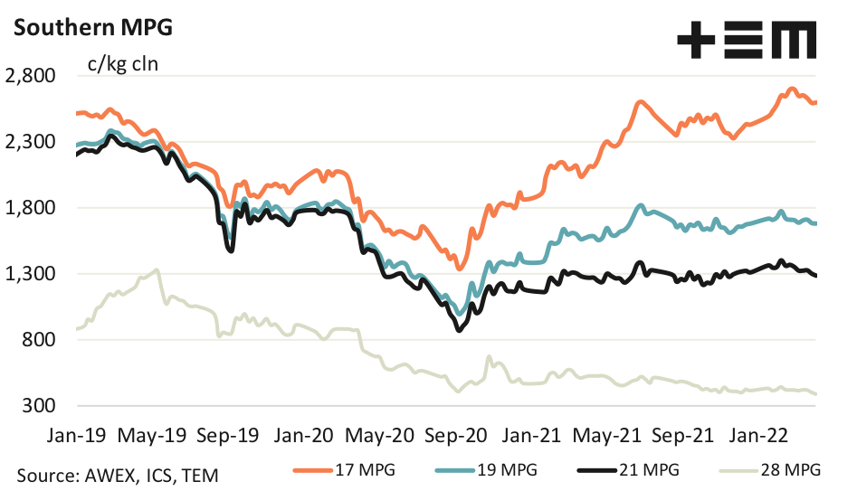 The merino greasy wool market continues to trend sideways, with little change except that induced by changes in the exchange rate. The weekly offering should pull back after Easter, which is a normal seasonal pattern. This will be required as the supply chain will go into its quiet period in the middle of the calendar year (the northern hemisphere summer). Further substantial upside in prices from current levels appears unlikely for the merino market in 2022 in a world working its way through a number of economic shocks.