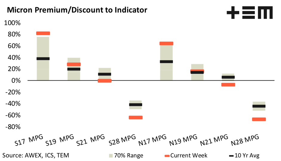 With fine wool micron premiums stretched, there is less scope for fine merino prices to lift if prices for the broader side of the micron distribution are stable. Amongst these market dynamics, vegetable fault continues its normal seasonal path higher with premiums and discounts responding accordingly.