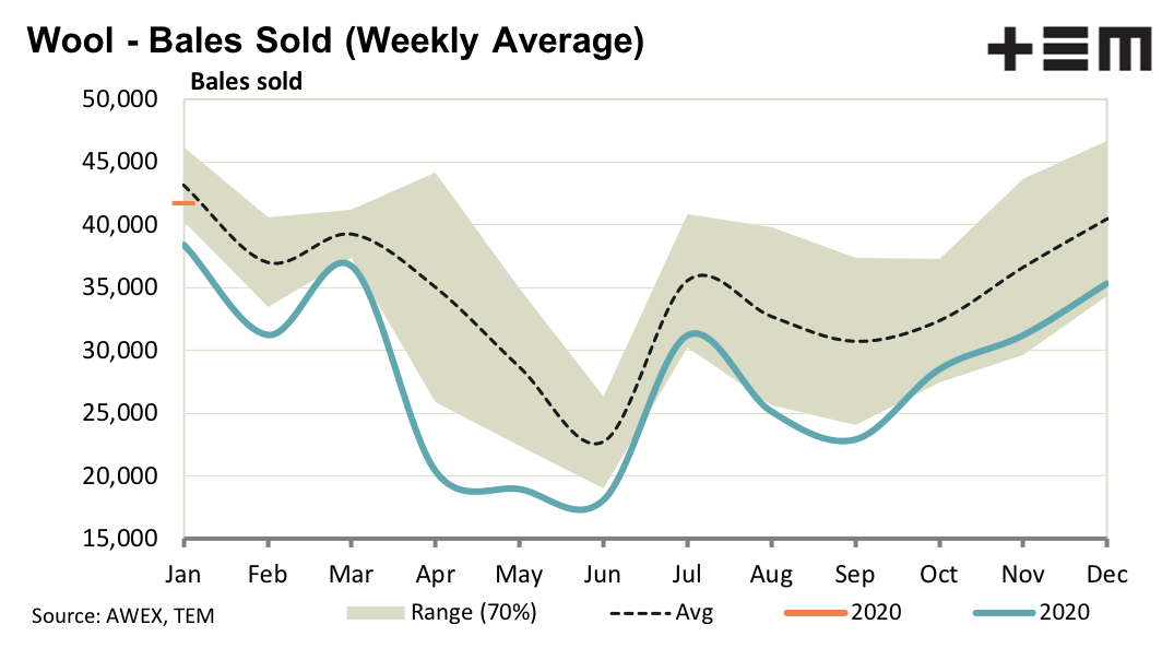 On the supply side AWTA volumes were steady in January, although the changes by micron category varied from plus 43% (21 micron) to minus 39% (15 micron). Improved clean fleece weights look to be helping supply in eastern Australia.