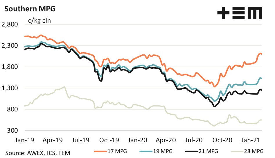 The 28 MPG has picked up in relation to the 21 MPG, trading at 0.44 of the 21 MPG. Rising prices for man made fibres during the past few months will also help crossbred prices. The supply of the core 27-30 micron crossbred categories was down 5% as measured by AWTA volumes in January, Finer crossbreds were down even more while broader crossbred volumes (31 micron and broader) were up by 26%.