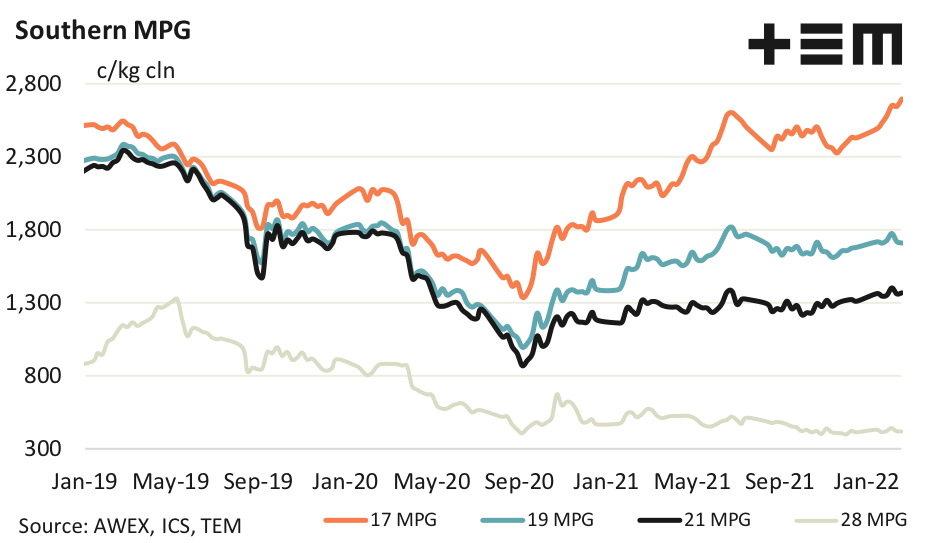 The 17 MPG lifted strongly this week, with the 17 to 21 MPG premium rising to its highest level in cents per kg terms since 2001. However in US dollar terms the premium is close to its recent peak level reached in mid-2021, and there are reports of some shifting of orders out of 17.5 into 19.5 micron.