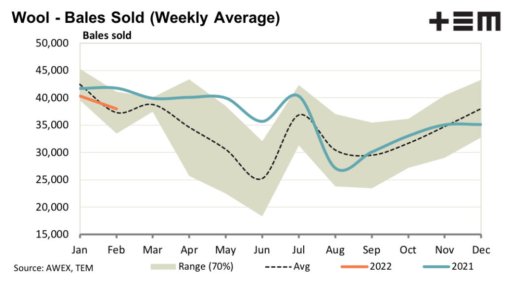 The broader merino indicators held their value this week, with some solid RWS premiums paid. These have been averaging, as a rule, in the range of 200-300 cents in February. Feedback out of the supply chain indicates no great issue with the current price levels. In the short term it seems that logistic interruptions are the biggest risk to the market.