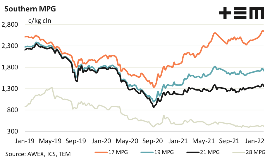 The 21 MPG eased this week, towards the middle of its trading range. Exporter feedback indicates prices are likely to ease again, depending on pass in rates. It is likely to be a rough week for faulty types (low yield, high vegetable fault, colour, cott and so on) with RWS accredited wool likely to be the exception.