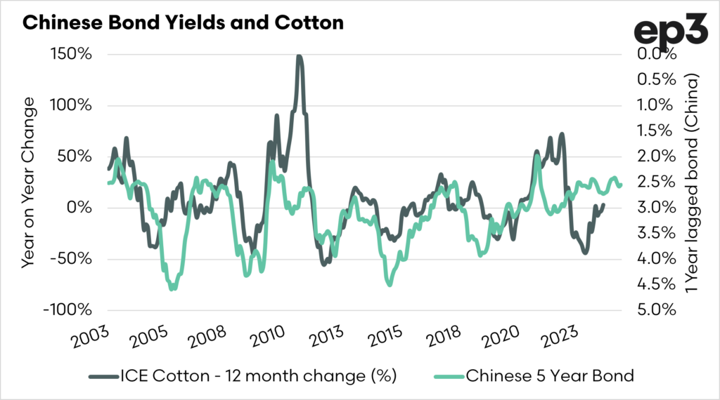 The Chinese bond yield, when lagged, seems to provide an insight into the trend of fibres. When bond yields decline, fibre prices tend to perform well, and when they increase, that tends to correspond to a time of declining fibre prices.