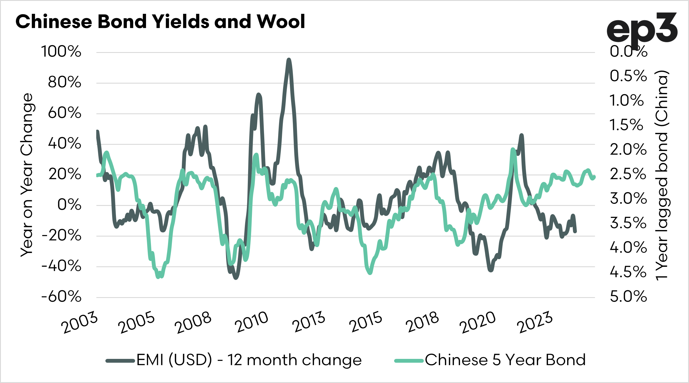 China is clearly a powerhouse of the global economy, especially since the turn of this century. Chinese bonds have been a strong indicator of wool performance over much of that time.