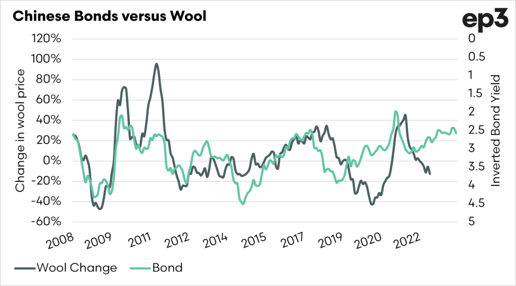 China is clearly a powerhouse of the global economy, especially since the turn of this century. Chinese bonds have been a strong indicator of wool performance over much of that time.