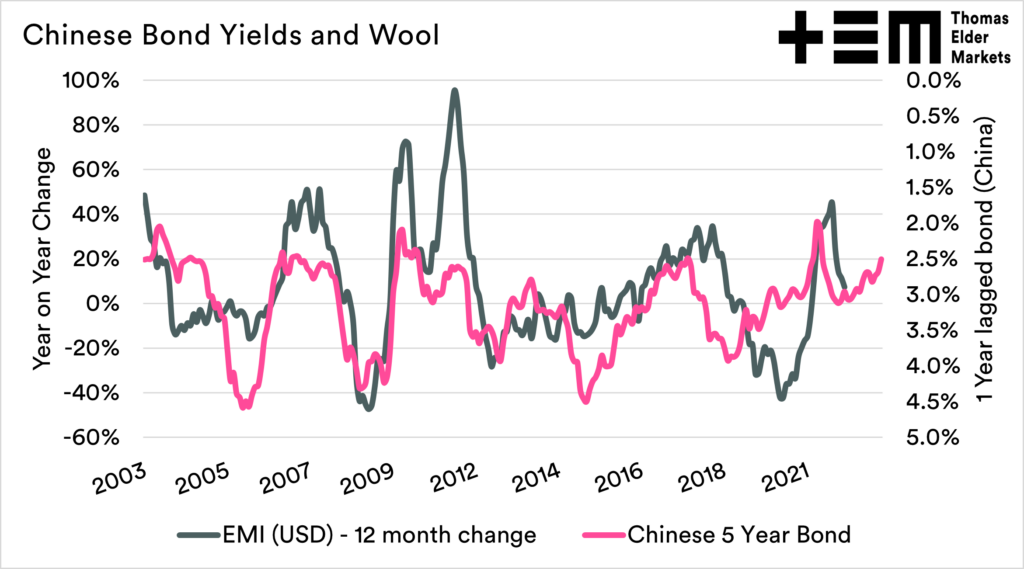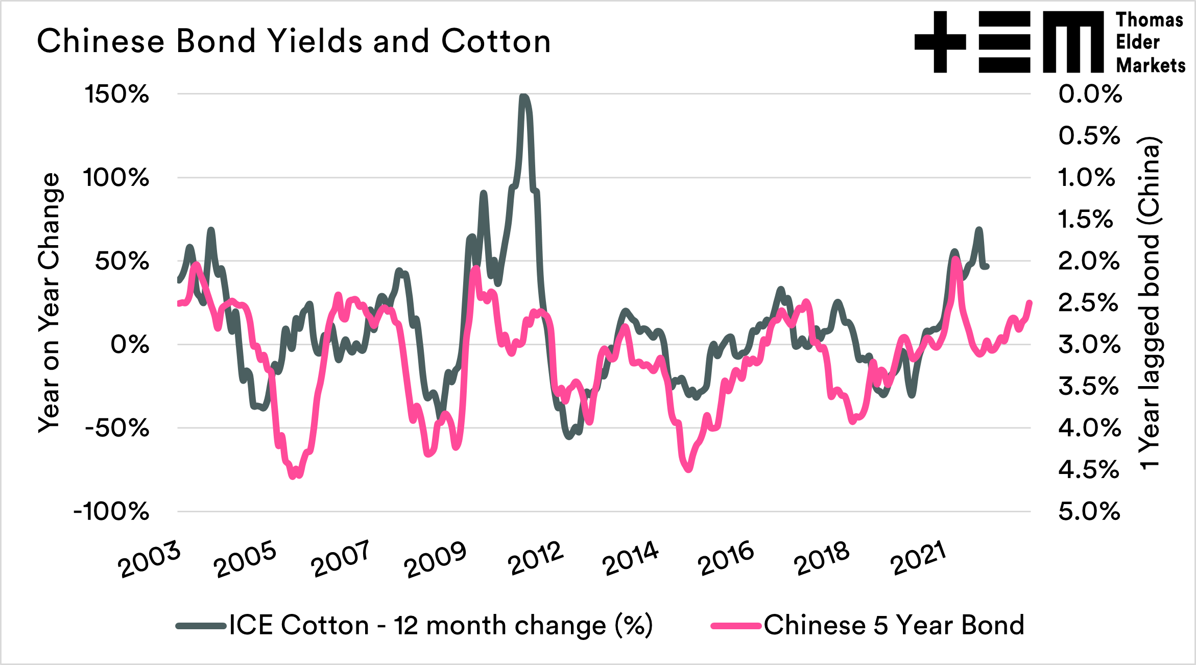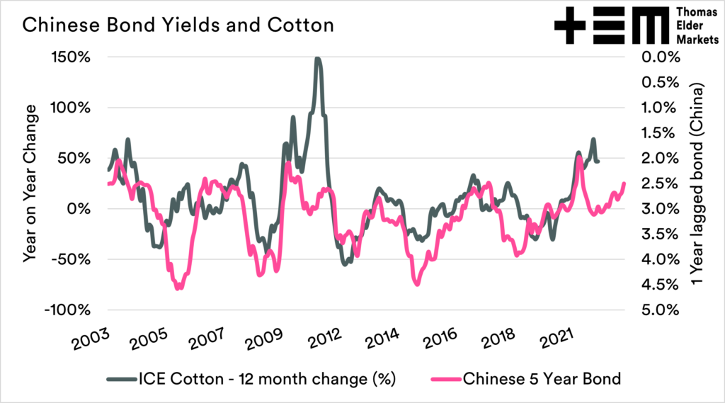 The charts below show the Chinese bond yield with a one year lag against the yearly change in Cotton/Wool price from 2003 to the present.