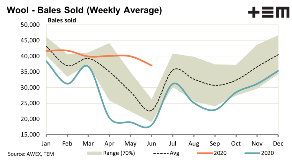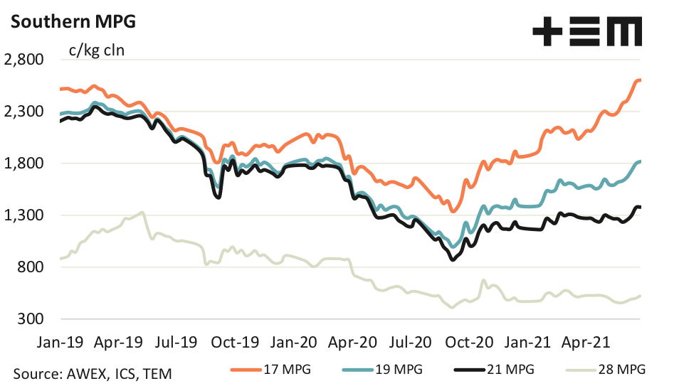 The supply of 19 micron wool looks to have been supplemented in recent months with grower stock as well as the natural increase in supply coming from improved seasonal conditions during the past 18 months (on average – not necessarily in every region). In US dollar terms the 19 MPG is holding at levels last seen in mid-2019 which is a solid recovery from the lows of 2020.
