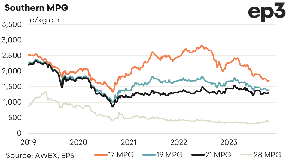 The forward market paints a similar picture. Buyers and sellers are spread either side of the Current cash price meeting in the middle irregularly to mitigate each other’s risk. This week’s trades were executed either side of the closing levels. 18.0 micron at 1520 (cash1527), 19.0-micron 1415 (cash 1413) and 21.0 at 1300 (cash 1294). All were for end November maturity. This highlights not only the lack of direction in the market but the concern on both sides of the potential break either way in these uncertain economic and political times.