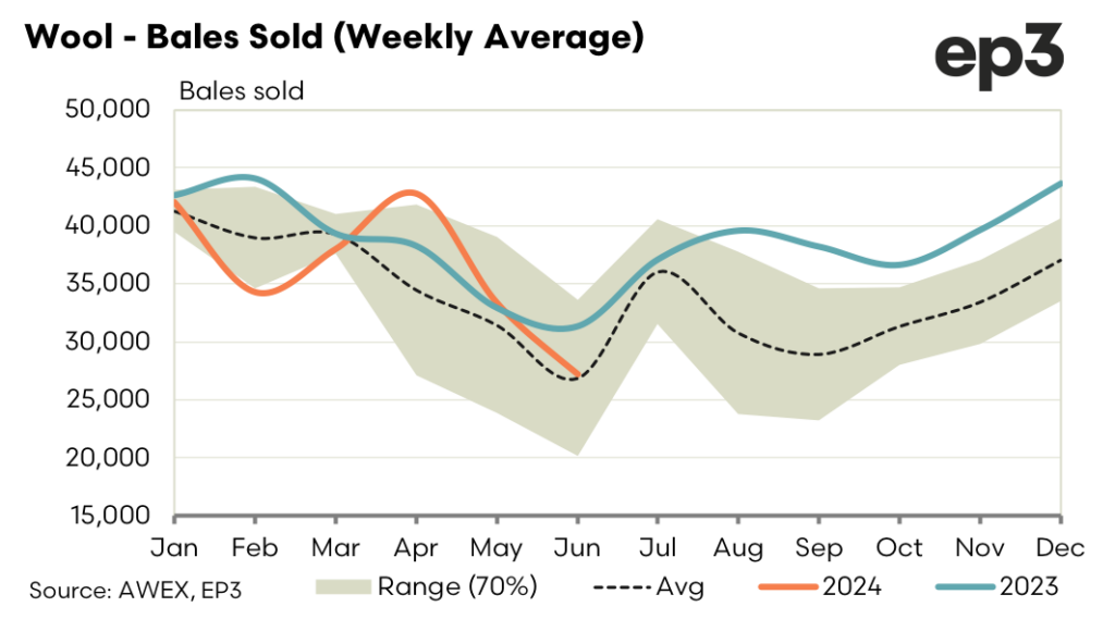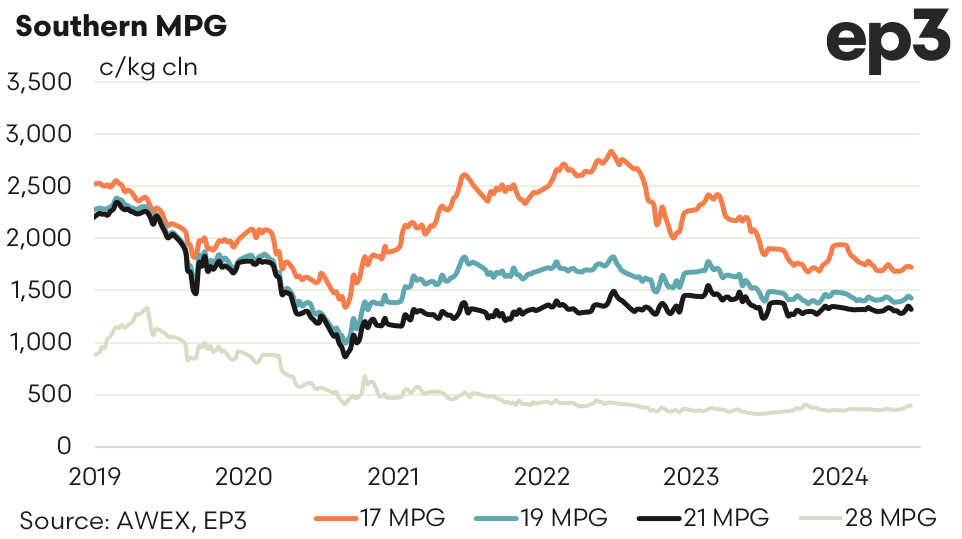 Next week has 40,000 bales rostered. Forward buyers are cautious waiting to see the reaction offshore to the pull back in prices. We are likely to see a continued ebb and flow of price levels as we navigate the last five weeks of the current season. Forward price opportunities are likely to arise for the spring and early summer as traders look to hedge their risk. Levels for late 2025 and 2026 remain at a 6% premium to cash at 1500 for 19.0 microns.