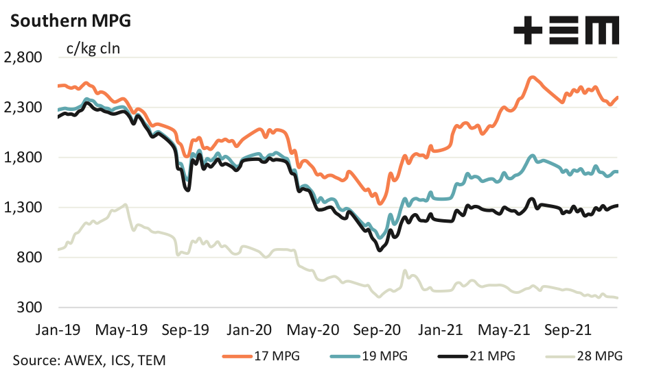 The merino fibre diameter continued to fine up in November, driven by eastern clips as the Western Australia clip is still broadening. Supply in 2022 will therefore start to narrow the gaps between micron price levels, which remain quite extreme.