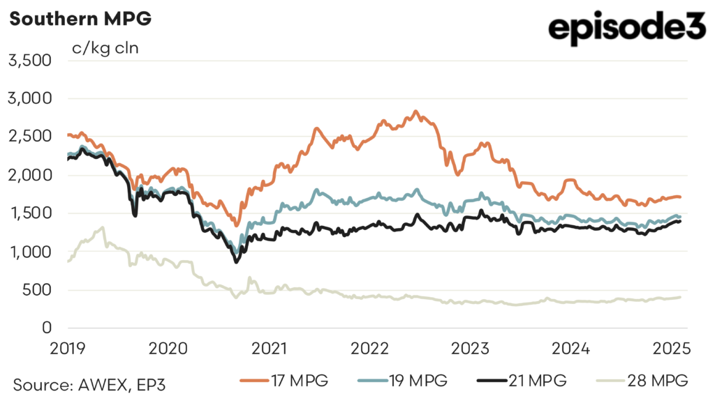 The auction market held up well over the Luna New Year week. Super fine merinos lost a little grown but the balance of the market firm to marginally dearer. Crossbreds outperformed the rest of the market although some credit must again be attributed to the strong USD.