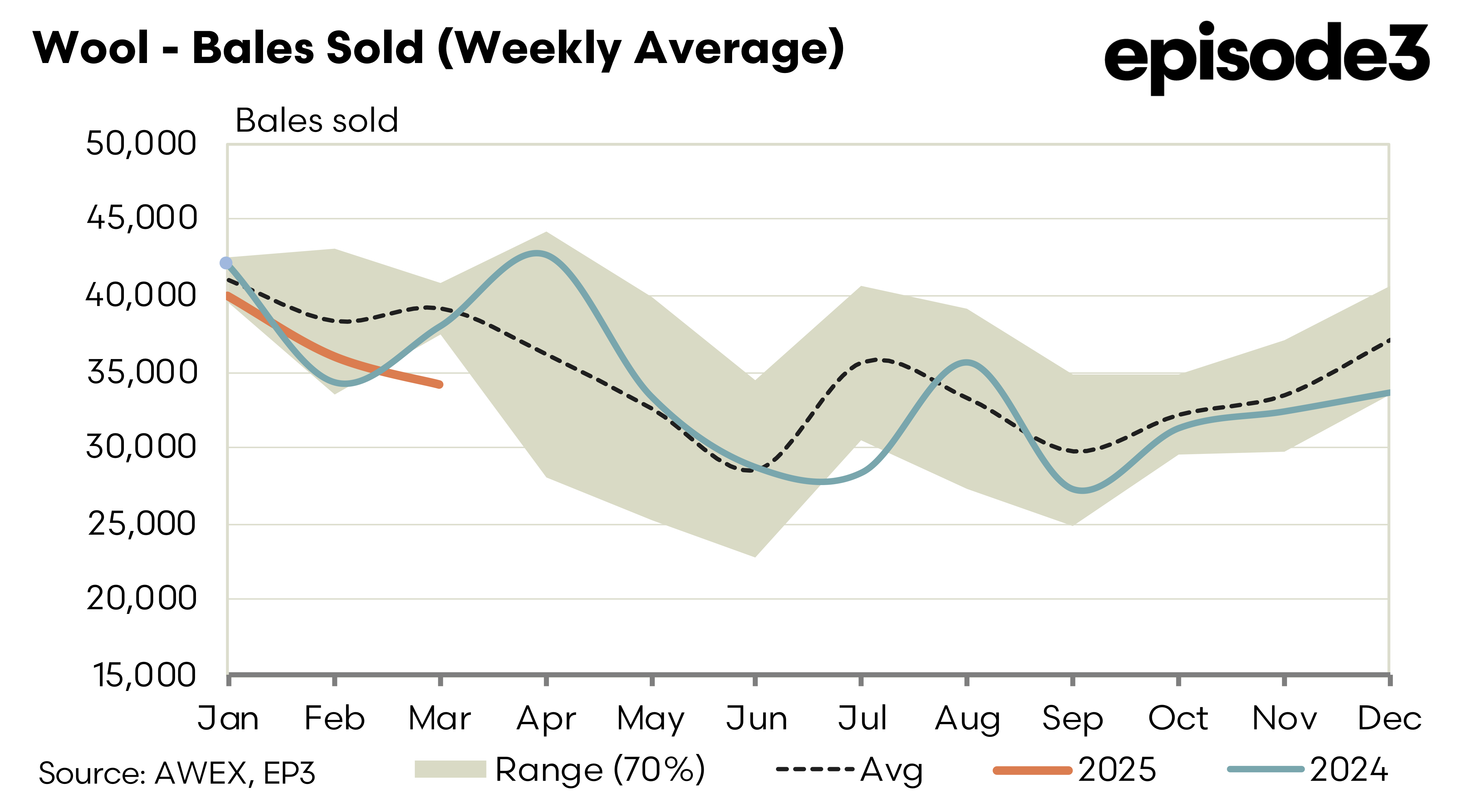 Forward levels for next will likely start a little under spot for the nearby window (April to June) as processors digest the rise of the last few weeks. Spring bidding is at a premium for fine wools (19.0 1575) reflecting the tight basis to the medium wools. A more cautious approach is likely on the 21.0 contract. Buyers likely to re-engage at similar levels to this weeks trades.