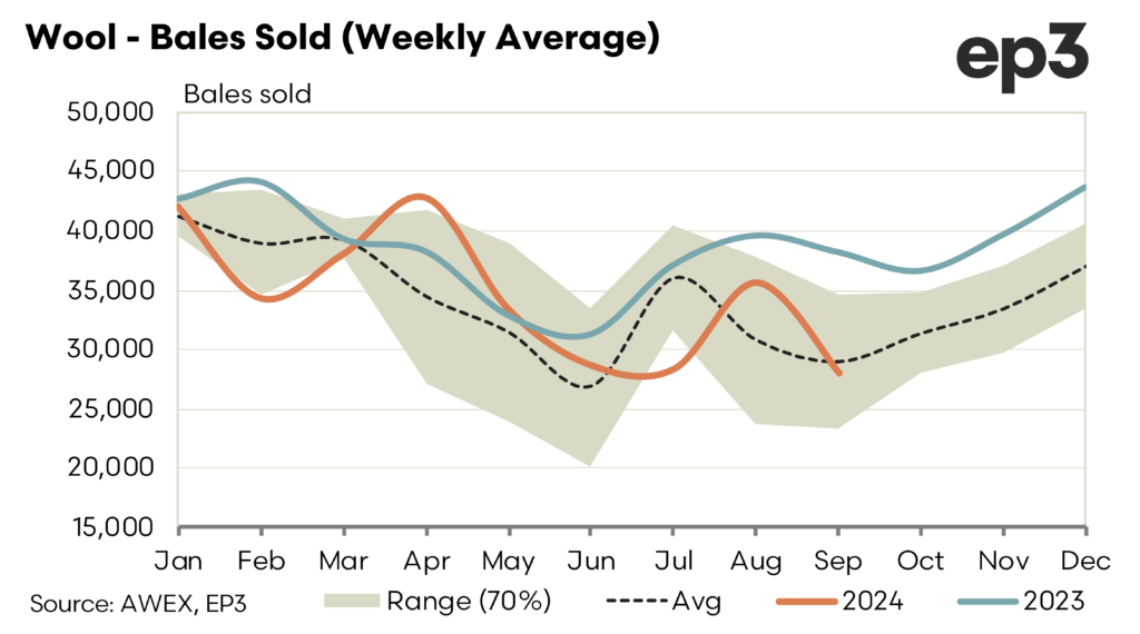 The forwards are showing a little more activity on the bid side. The prompt window remains unloved with September still at a discount to cash. The further we move out the better the price curve looks. December 2024 is bid at a slight premium to cash (10 to15 cents) across the main 19.0 and 21.0 categories. For a further 12 months out (November2025 to January2026) the premium for the 19.0 index is 130 to 160 cents. Other activity in the spring and summer centred around 18.0 micron with October bid 1430 and December 1445 a slight discount to the current spot of 1458.