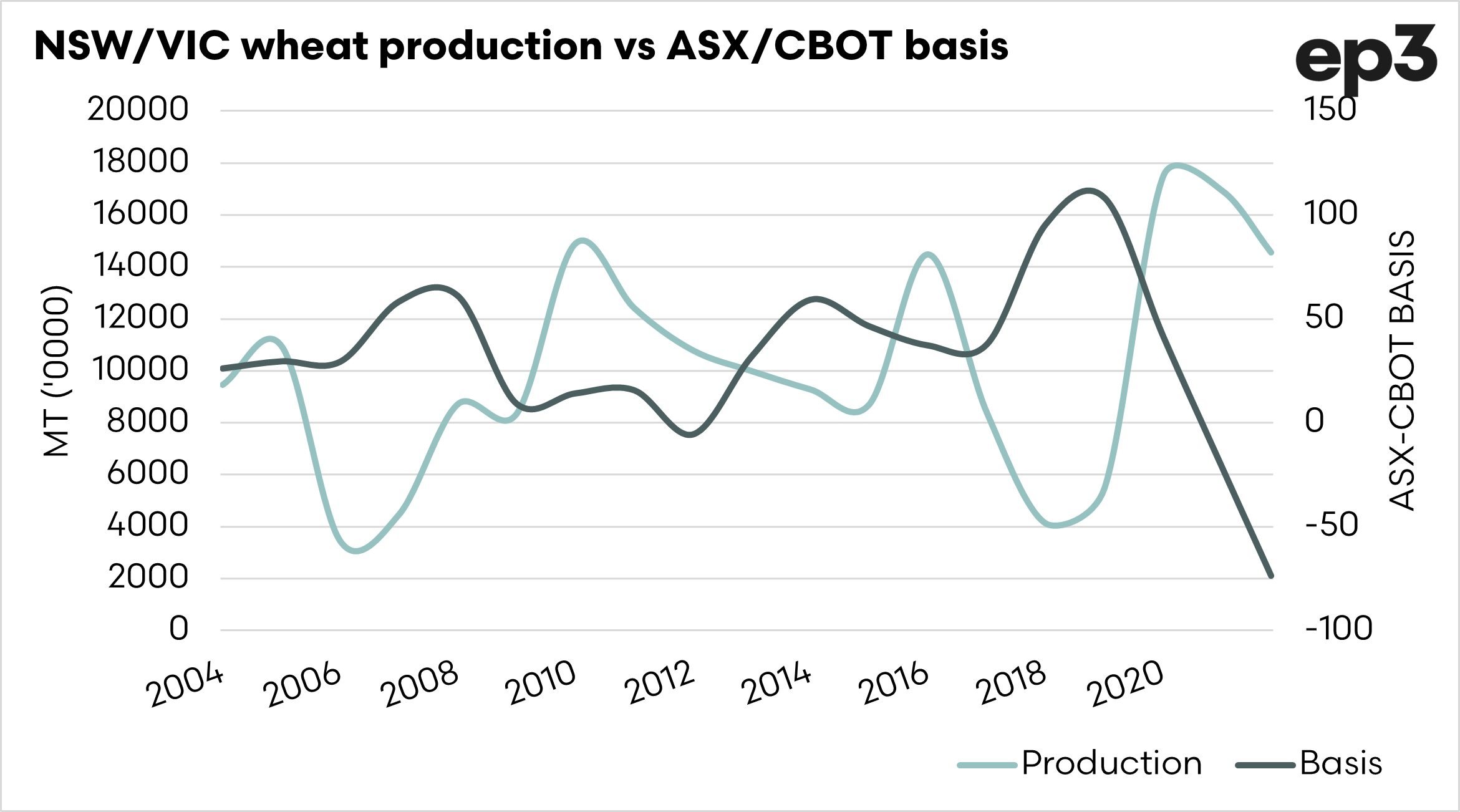 The converse occurs during a big year of production. The chart below shows the relationship between production and ASX basis (to CBOT). The period chosen for the basis is December, as this is when the majority of grain will be sold, for 2022, we have chosen the current month.