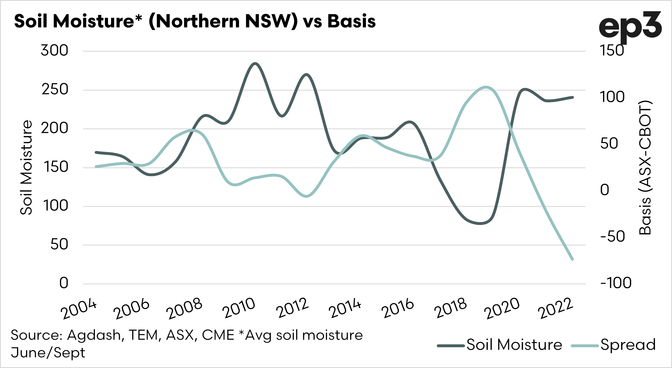 The chart below displays soil moisture for northern NSW vs ASX to CBOT basis. The soil moisture is averaged from June to September.