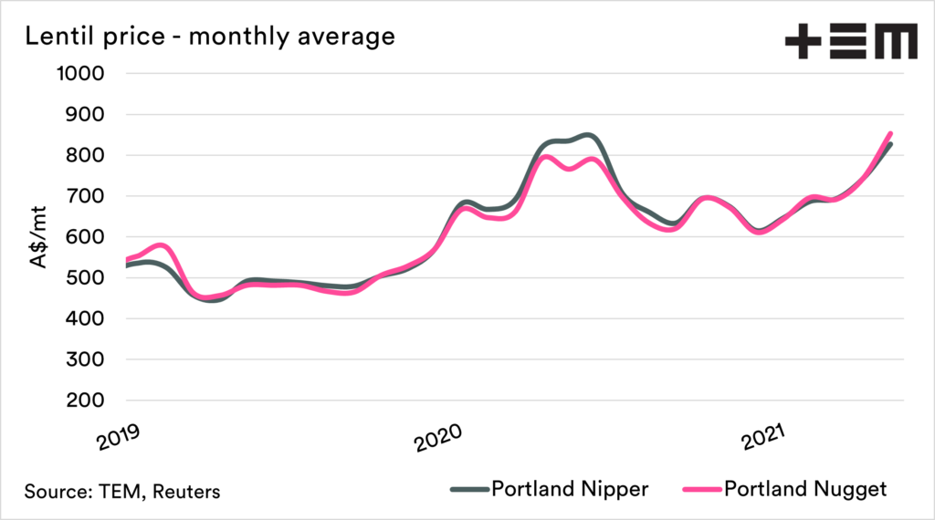 Lentils are a tough one at present. They are still under the spectre of import tariffs into India, but prices have been rising in recent months. A lot of this is due to speculation that India will reduce their import tariffs due to concerns that their crop is lower than official government estimates.