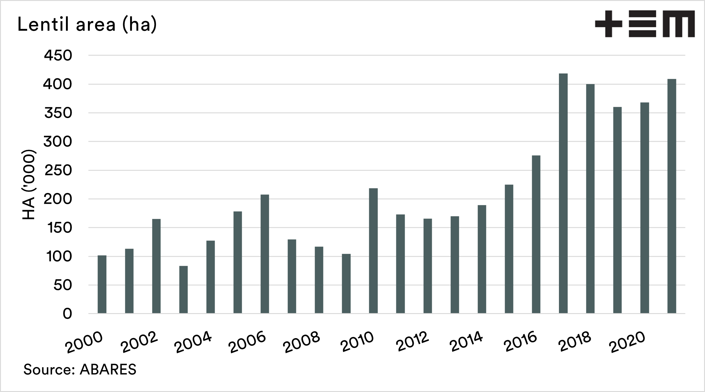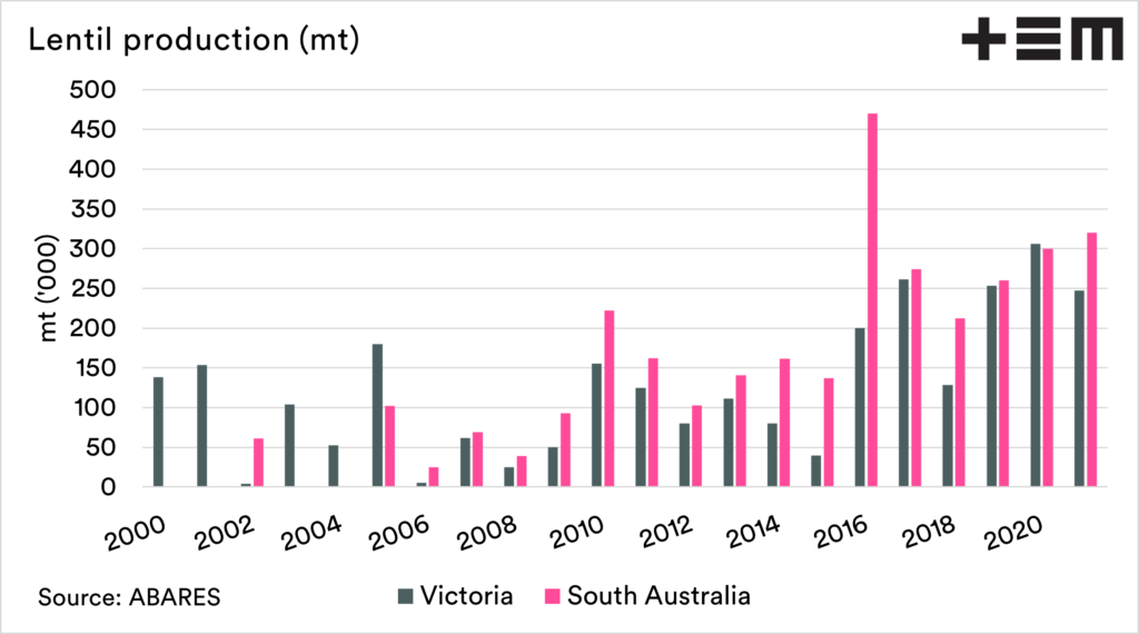 So whilst not to the heady days of recent years, still a very attractive price. The majority of the countries lentil crop is grown in South Australia and Victoria, in areas that haven’t had the best start in recent years.