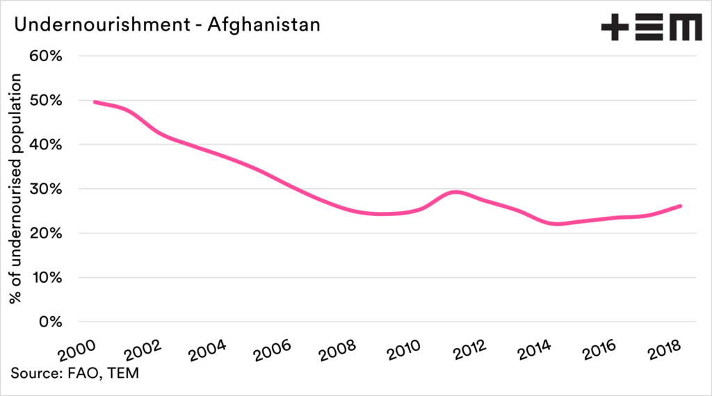 The improvement in nourishment is impressive, as it comes at a time of massively increased population. The reality is that a large part of the population are still malnourished, and the return of the Taliban could see a degrade in these improvements.