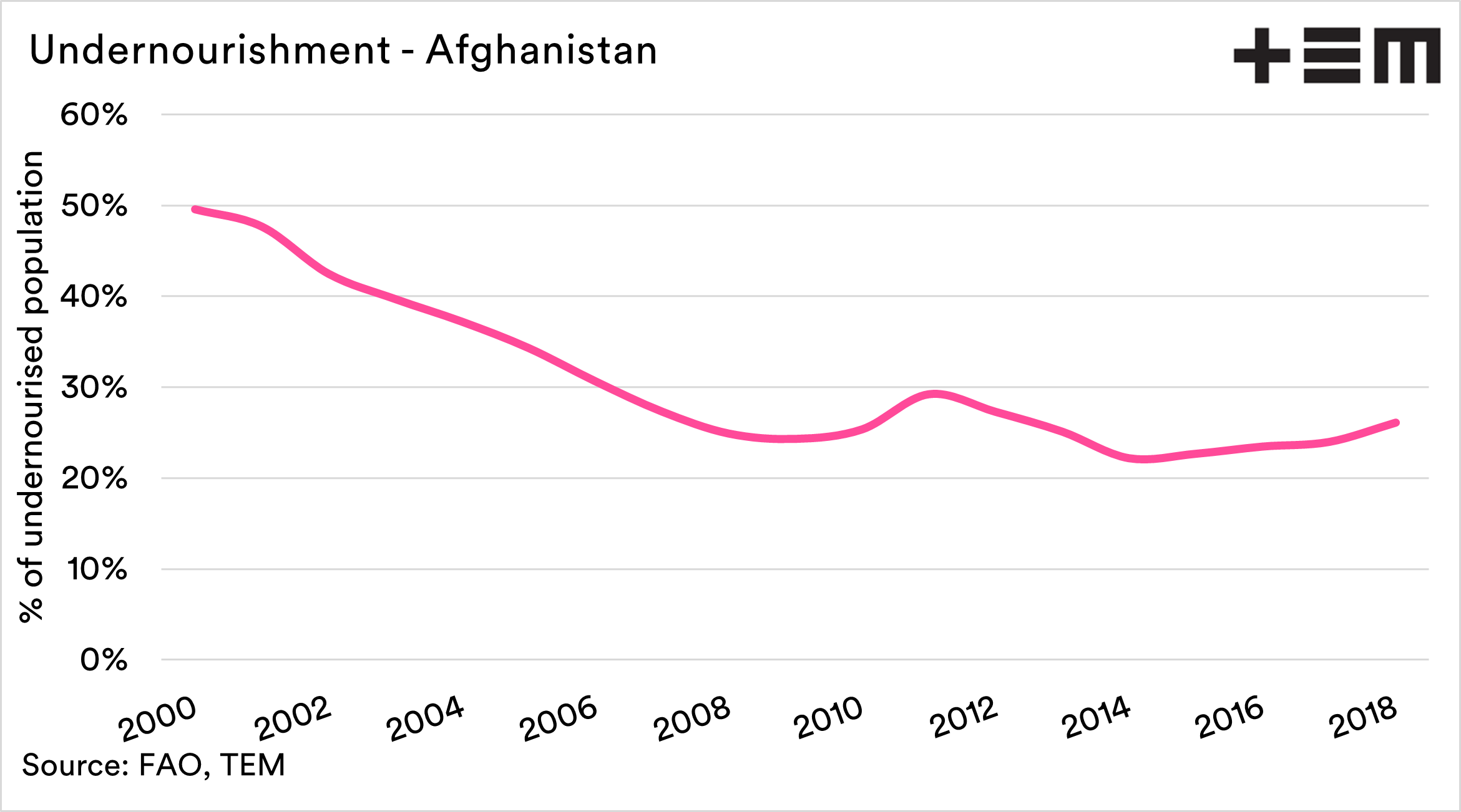 In the same time, undernourishment has fallen. At the turn of the century, Afghanistan had 50% of the populace suffering from undernourishment. Recent data shows undernourishment at 26% of the population.