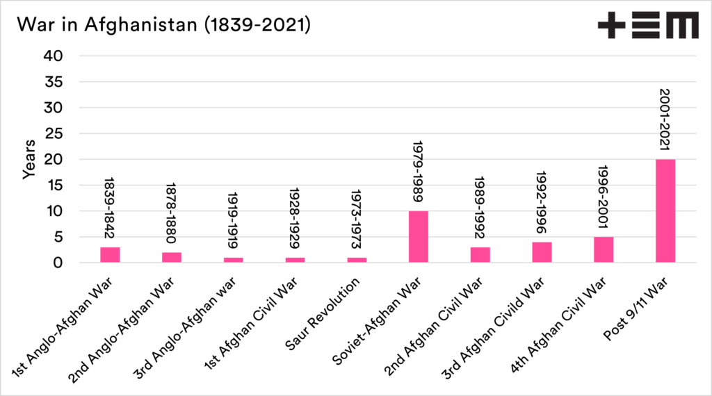 Afghanistan is a nation with a turbulent history, not just in the past twenty years but since the middle of the 1800s. Afghanistan has been in a state of almost constant war since 1979, with Russia, the allies, and civil wars.