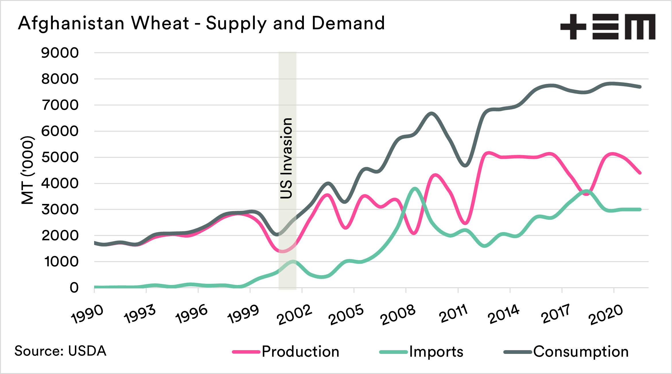The wheat supply and demand in Afghanistan has changed dramatically since the invasion in 2001. There have been huge increases across all factors.