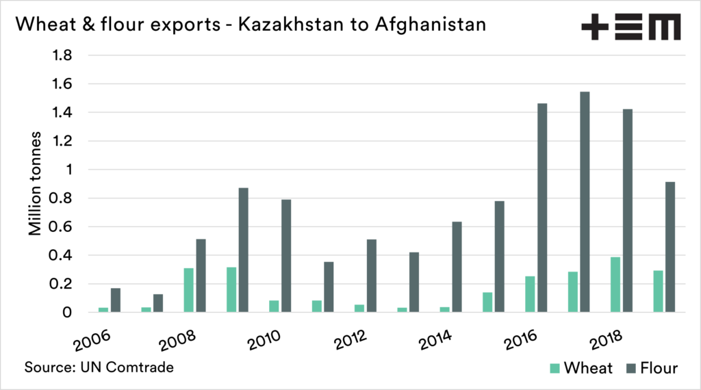 The biggest supplier to Afghanistan is Kazakhstan, one of the worlds largest wheat exporters. Much of the trade with Afghanistan is in the form of flour as opposed to straight wheat.