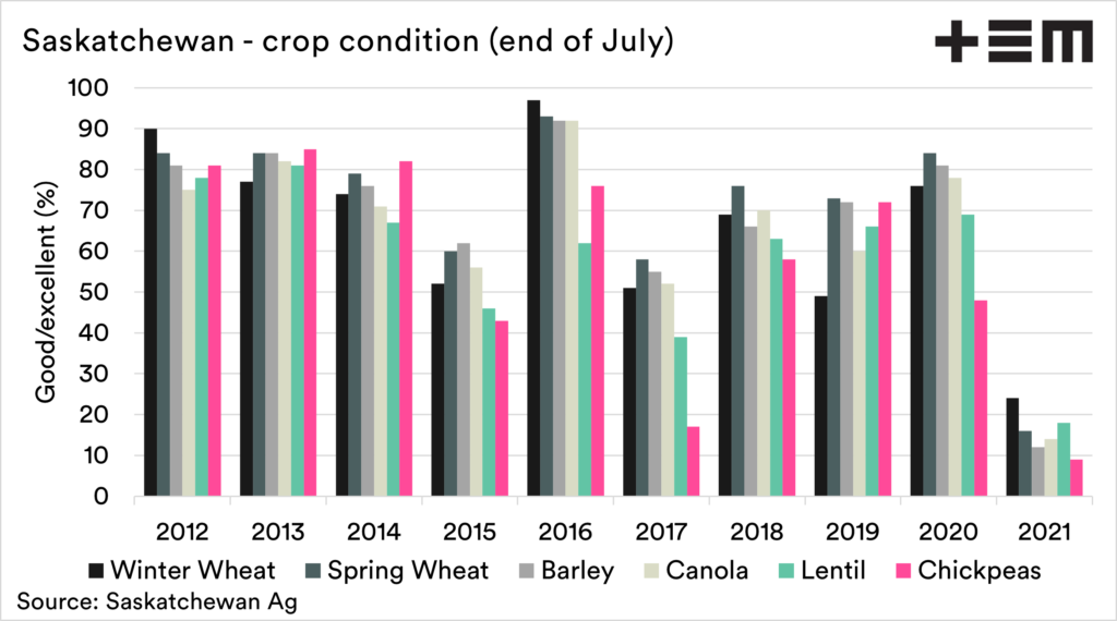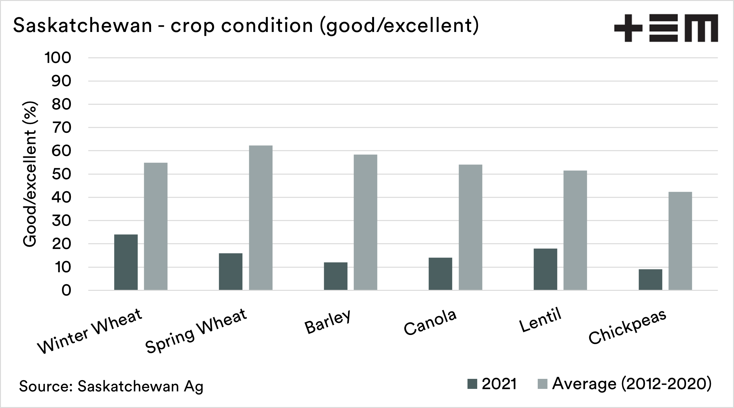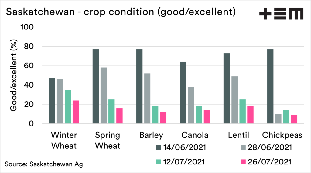 - Crop conditions have drastically fallen in recent months. As an example, lentils have dropped from 73% good/excellent in Mid-June to only 18% good/excellent in late July.